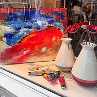 Peter Elias is de voorzitter van het Kunstcollectief Purmerend. Hij maakt abstracte schilderijen die verwonderen en uitnodigen tot dialoog. Elk werk is een explosie van kleur, beweging en vorm. De schilderijen vragen om niet alleen gezien maar ook ervaren te worden. Het schilderij “Twee werelden” toont een bruisende, levendige bovenlaag en een kalme, aardse onderstroom. Een schilderij dat uitnodigt om stil te staan bij contrast en verbinding. Dit schilderij past dan ook goed bij de Wereldwinkel. Daar komen de Westerse wereld en de wereld van ontwikkelingslanden bij elkaar, die samen verbinding zoeken ondanks de contrasten. Zo is trouwens elk kunstwerk in de etalageroute heel mooi in een passende omgeving geplaatst.