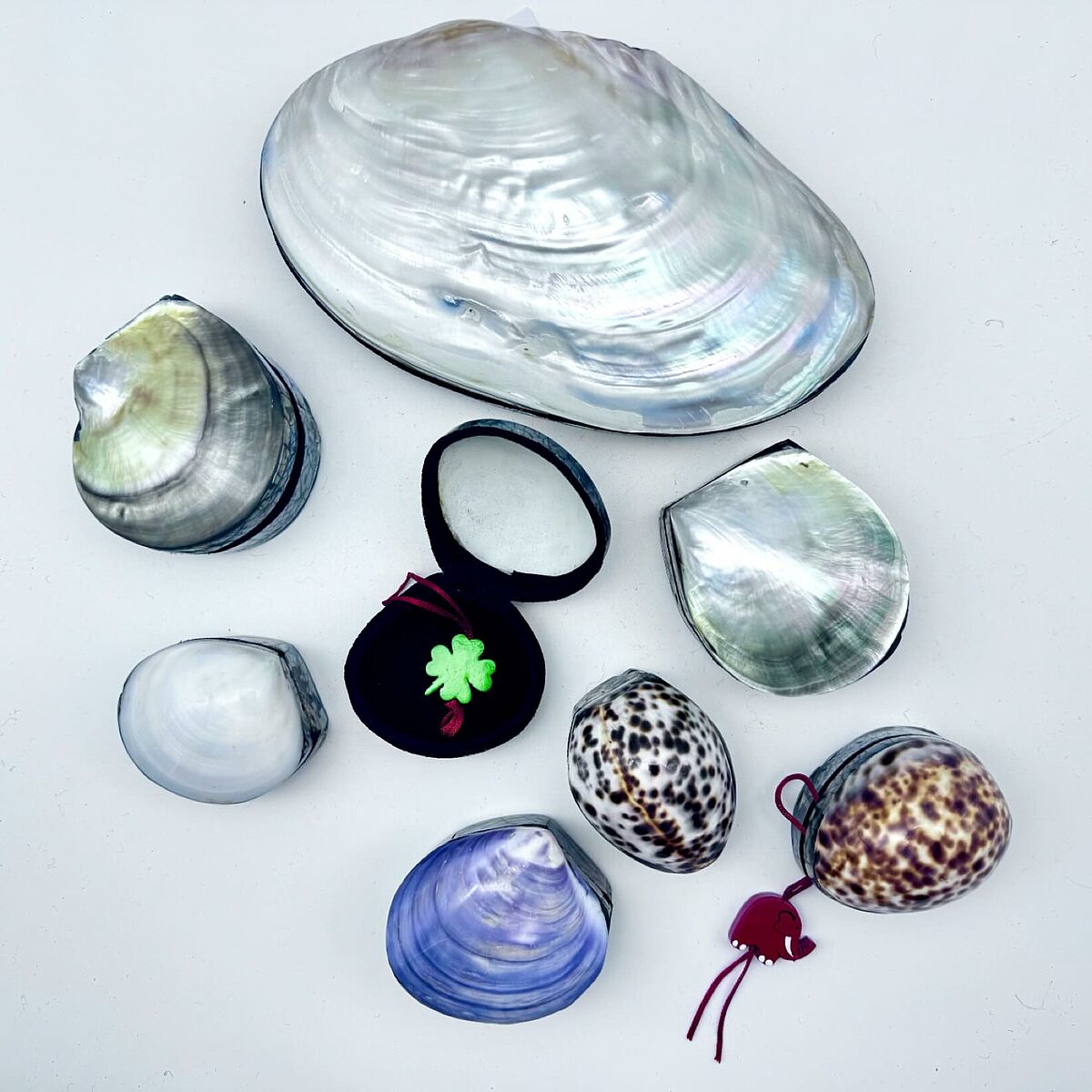 De schelpen komen uit Indonesië. De verschillende soorten schelpen maken elke uitvoering uniek. Er zijn schelpen van Panapea, van Kauri schelp (met tijgermotief), parelmoer e.d. Kleine familiebedrijven maken de schelpendoosjes met zorg en met de hand. Studio Terra is een leverancier ervan. Deze studio werkt bewust met ambachtslieden uit landen waar eeuwenoude tradites worden voortgezet met liefde en toewijding.