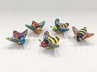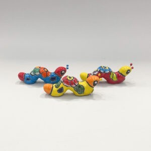 Kleurrijke, keramieken worm lengte 12 cm, breedte 3 cm. Van de klei die uit de heuvels komt, wordt gietklei gemaakt en vervolgens in mallen gegoten. Wanneer de klei opgedroogd is, gaan de voorwerpen in een elektrische oven. Na het bakken worden de voorwerpen voorzien van een laagje glazuur waarop eerst met potlood een ontwerp getekend wordt en daarna ingekleurd met verf. Vrouwen beschilderen de dierfiguren met een eigen ontwerp waardoor elk patroon uniek is. De producten gaan voor een 2e keer de oven in om de mooie, volle kleuren zichtbaar te laten worden. Het fysiek zware werk, zoals het gieten van de voorwerpen en het in- en uitladen van de ovens wordt door mannen gedaan. De schildertechniek is door de Spanjaarden naar Mexico gebracht en is hier verder ontwikkeld waarbij de kleurrijke Mexicaanse invloeden voelbaar zijn. Ieder product is op 1200℃ gebakken en is geschikt voor zowel in huis als in de tuin. Je moet ze wel tegen vorst beschermen. Vaak zijn de vrouwen alleenstaande moeders. Er wordt rekening gehouden met het combineren van werk en het alleenstaand ouderschap. De arbeidsomstandigheden zijn er goed: uit de zon en de wind, schone werkplaats, prettige werksfeer, leefbaar loon en goede arbeids-voorwaarden.Goed om te weten: een gedeelte van de opbrengst wordt geïnvesteerd in goede productiemiddelen, zoals een elektrische oven. Dankzij de nieuwe oven stijgt de productie, waardoor de werkgelegenheid en toekomstkansen kunnen groeien.